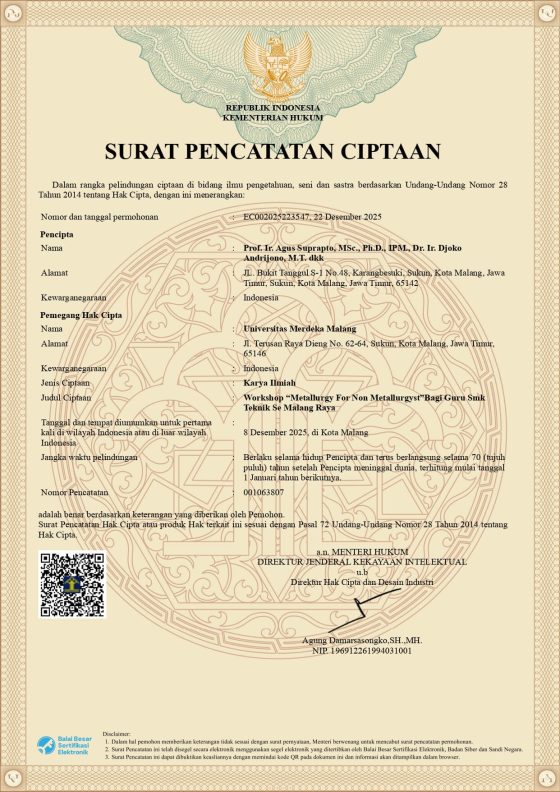 Surat Pencatatan Ciptaan: Workshop “Metallurgy For Non Metallurgyst”Bagi Guru SMK Teknik Se Malang Raya